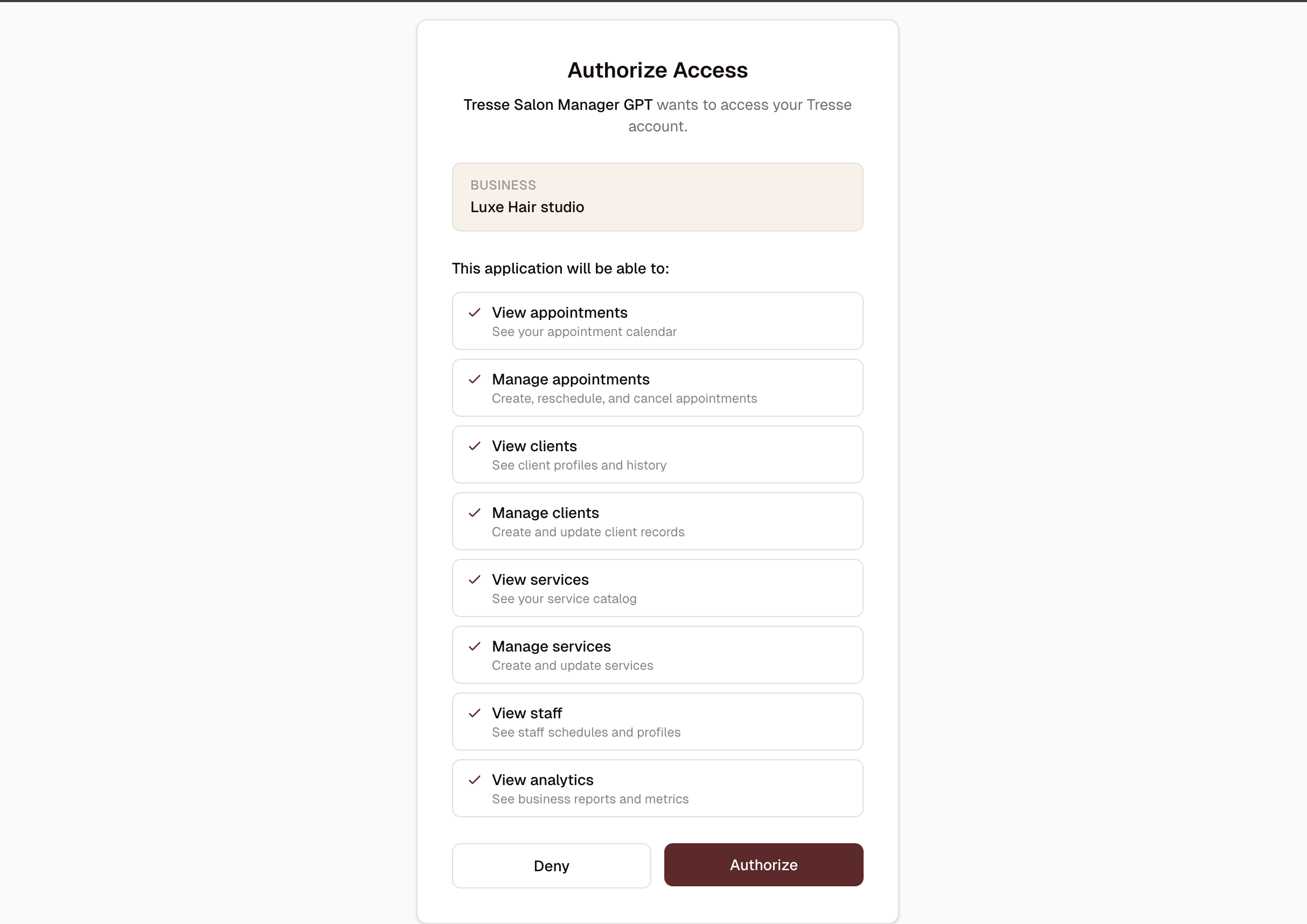 After signing in with your Tresse account, you will see an authorization screen showing your business name and the permissions the GPT is requesting.